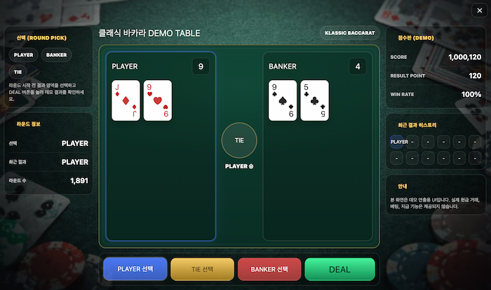 플레이어/뱅커/타이(Tie) 선택 UI와 최근 결과 히스토리 표시 기능을